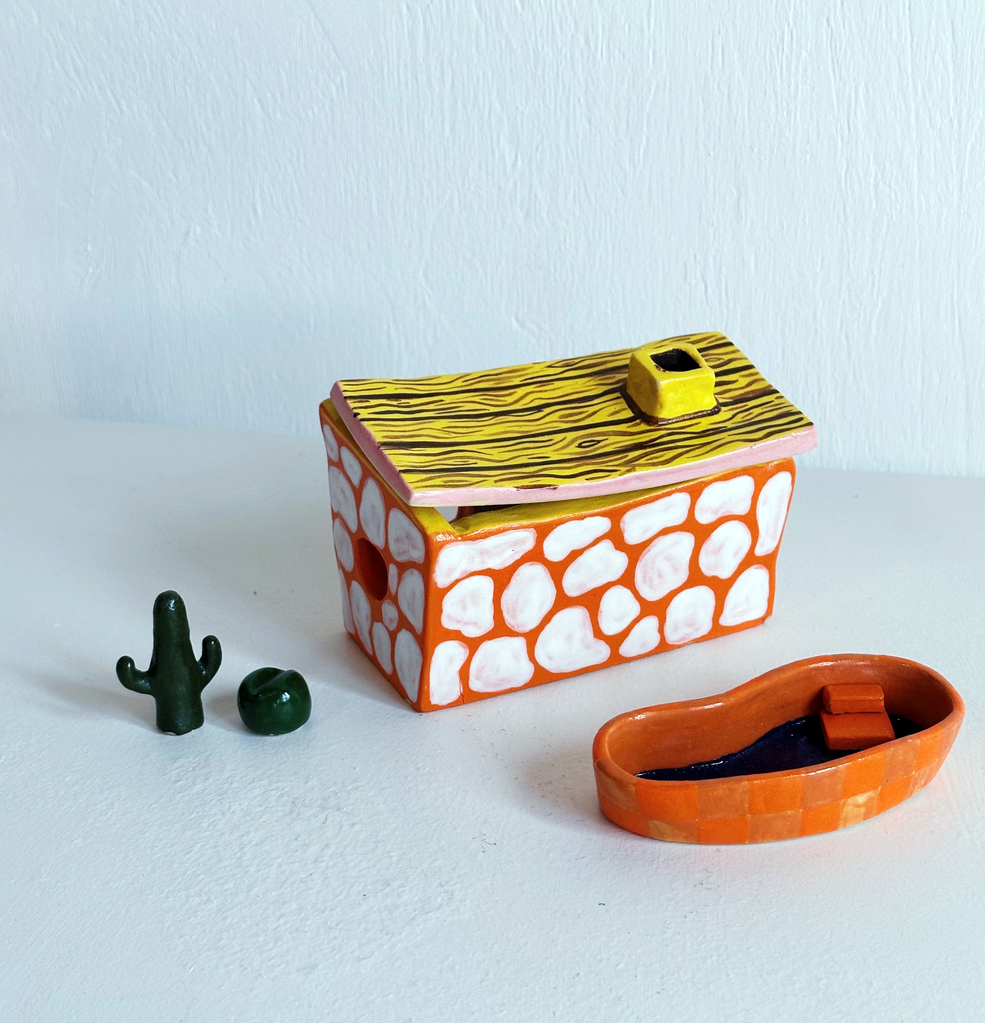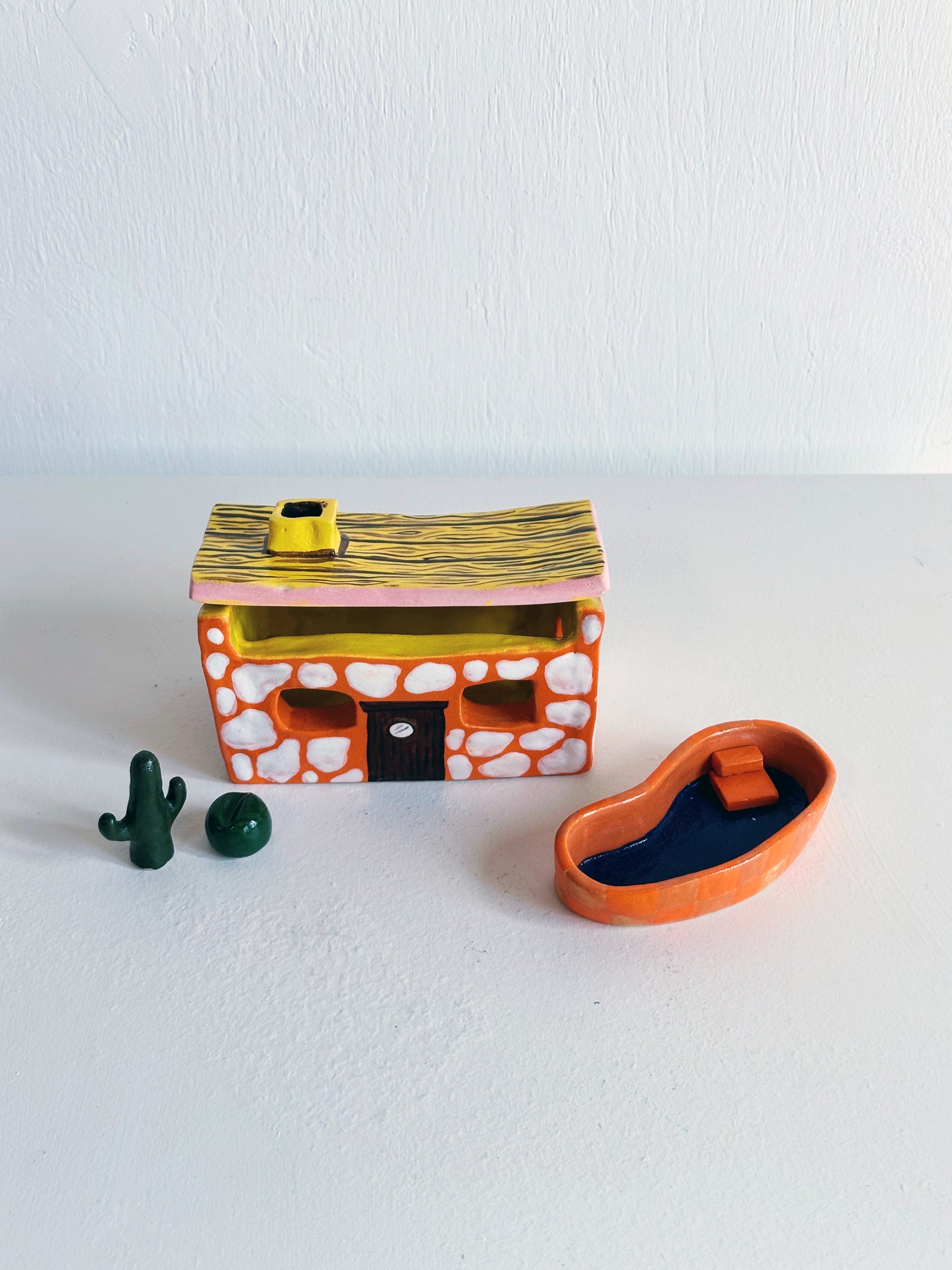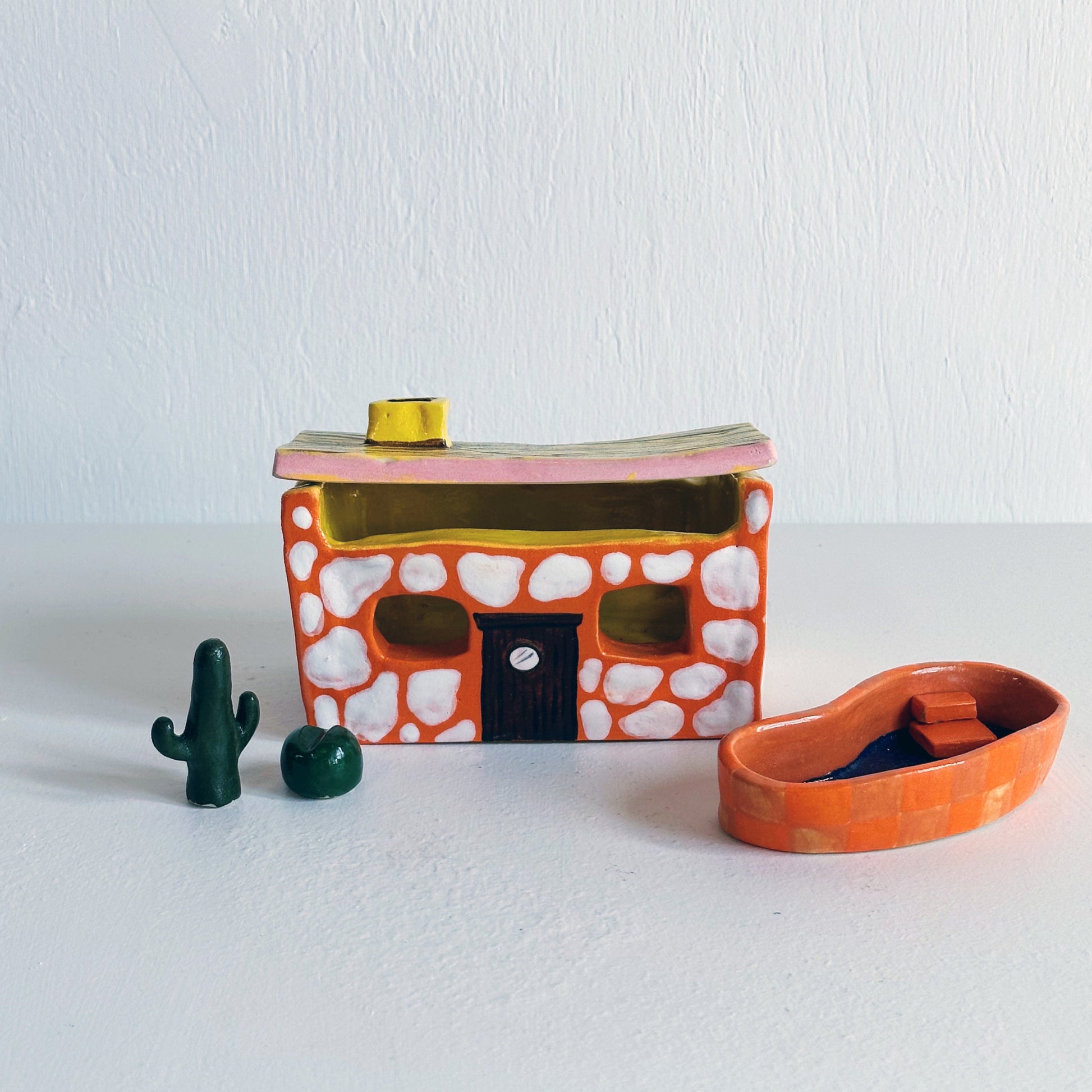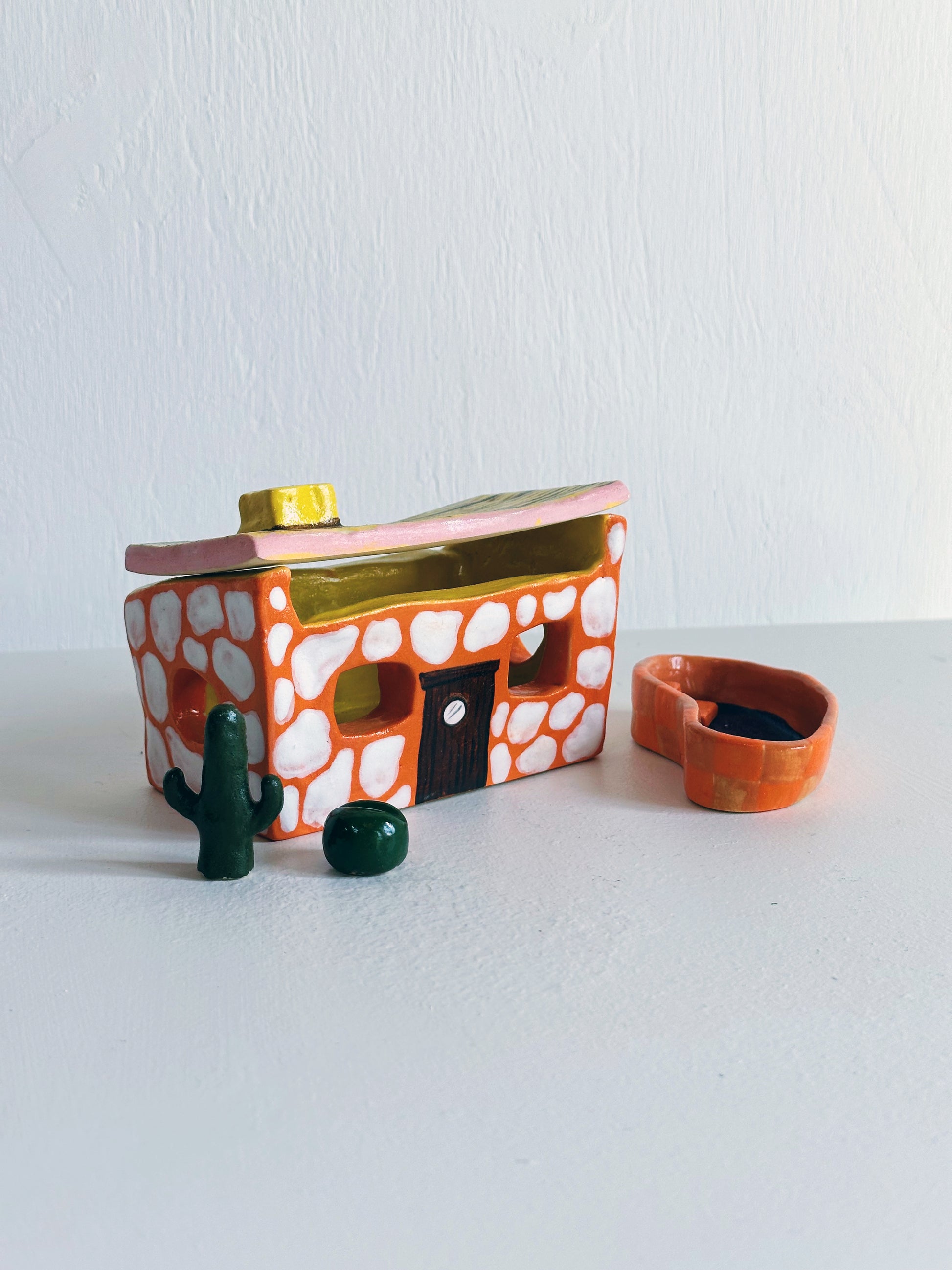 Hand-sculpted, glazed and fired to perfection, this miniature clay house is what happens when a mid-century architect takes a wrong turn into Bedrock. With chunky curves, and a colour palette straight from a Palm Springs motel poolside in 1962, it’s equal parts modernist fantasy and prehistoric party pad.