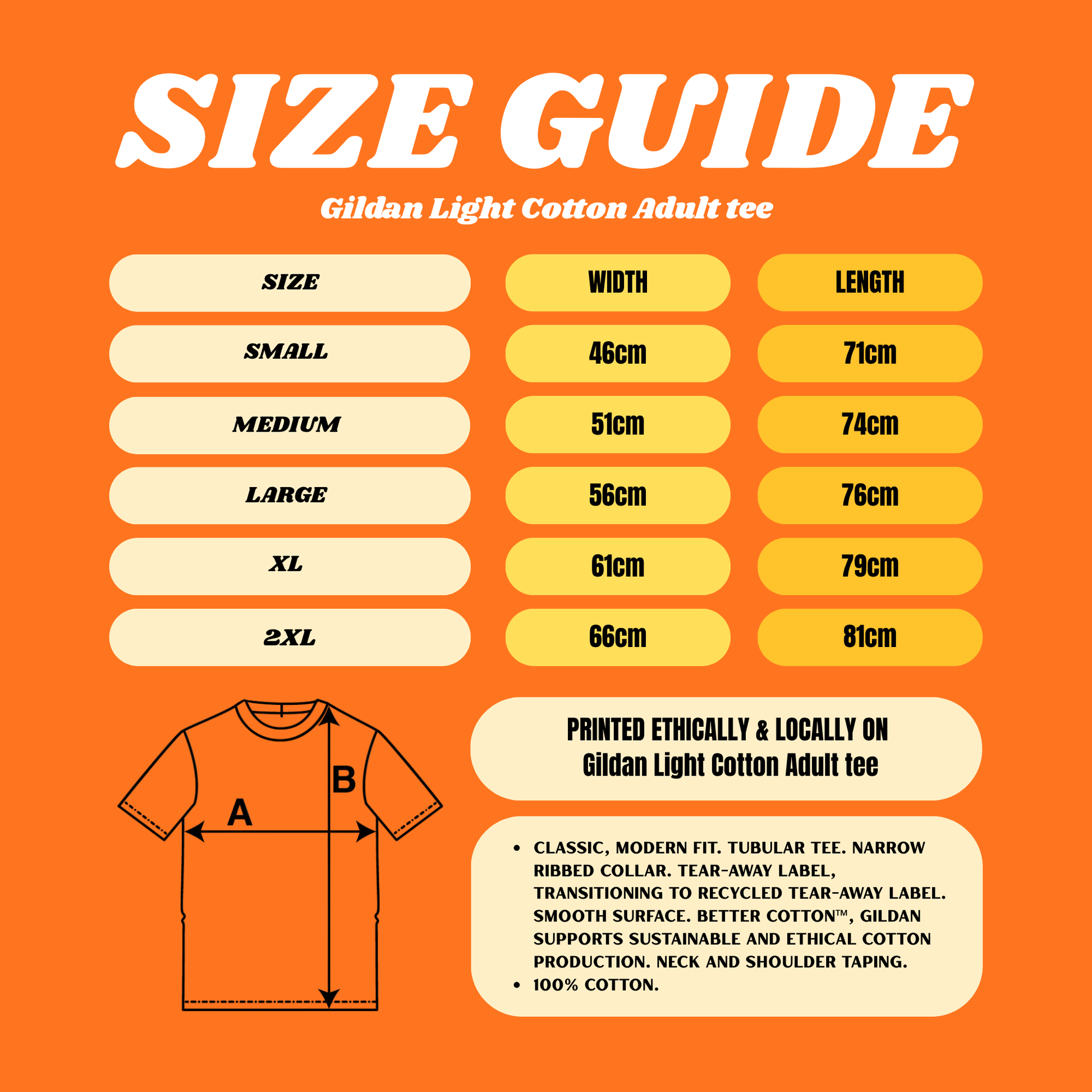 Printed in Melbourne Australia on Gildan Light Cotton Adult tee