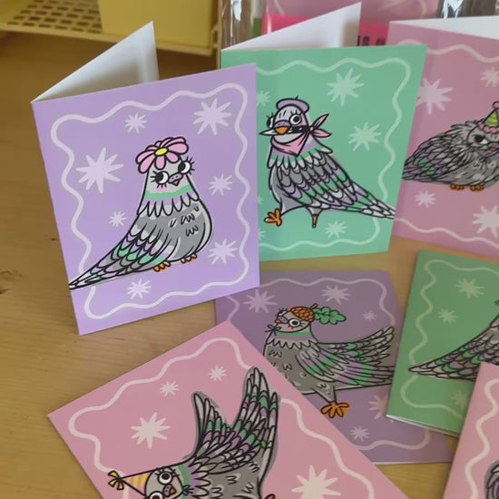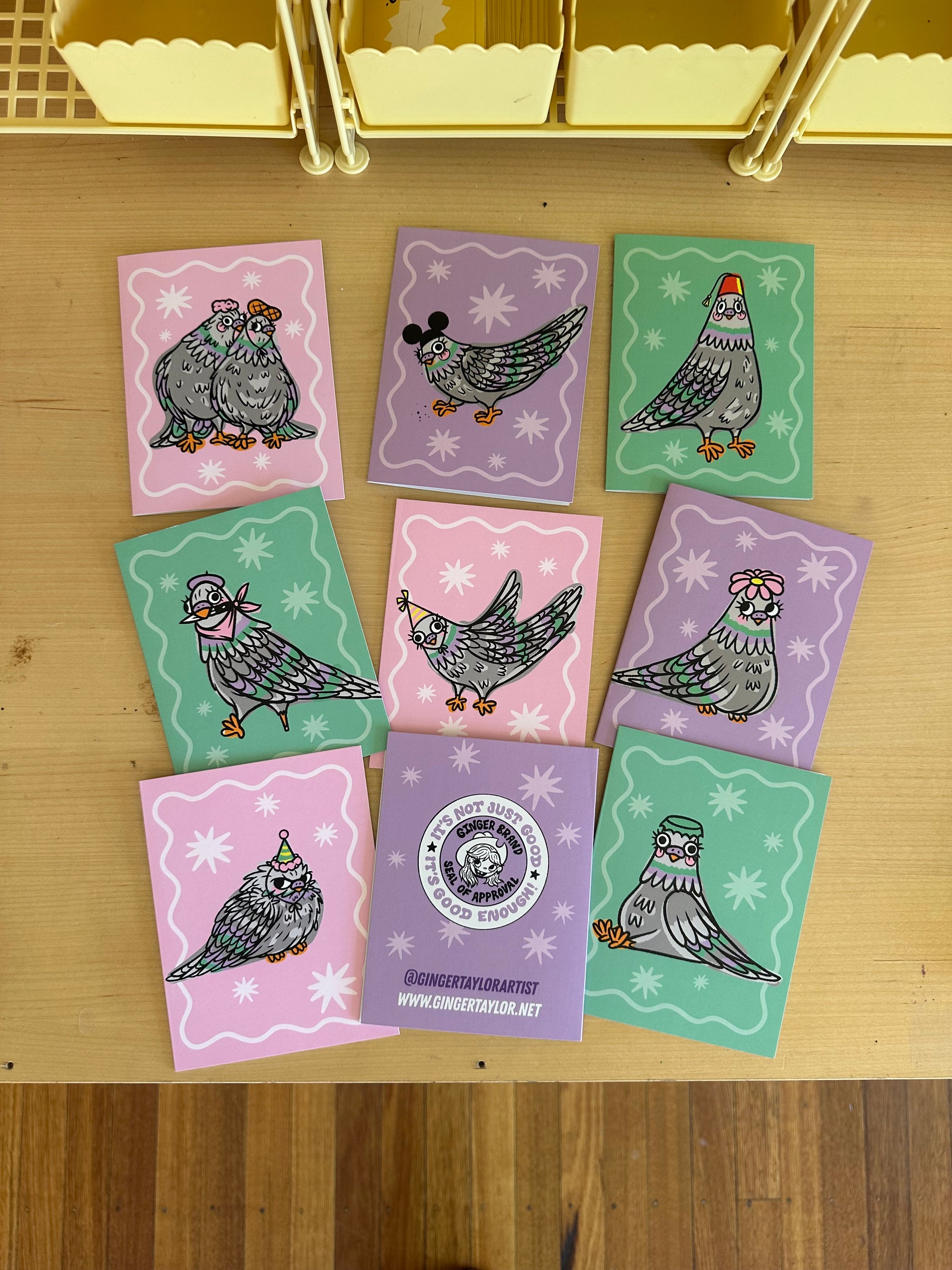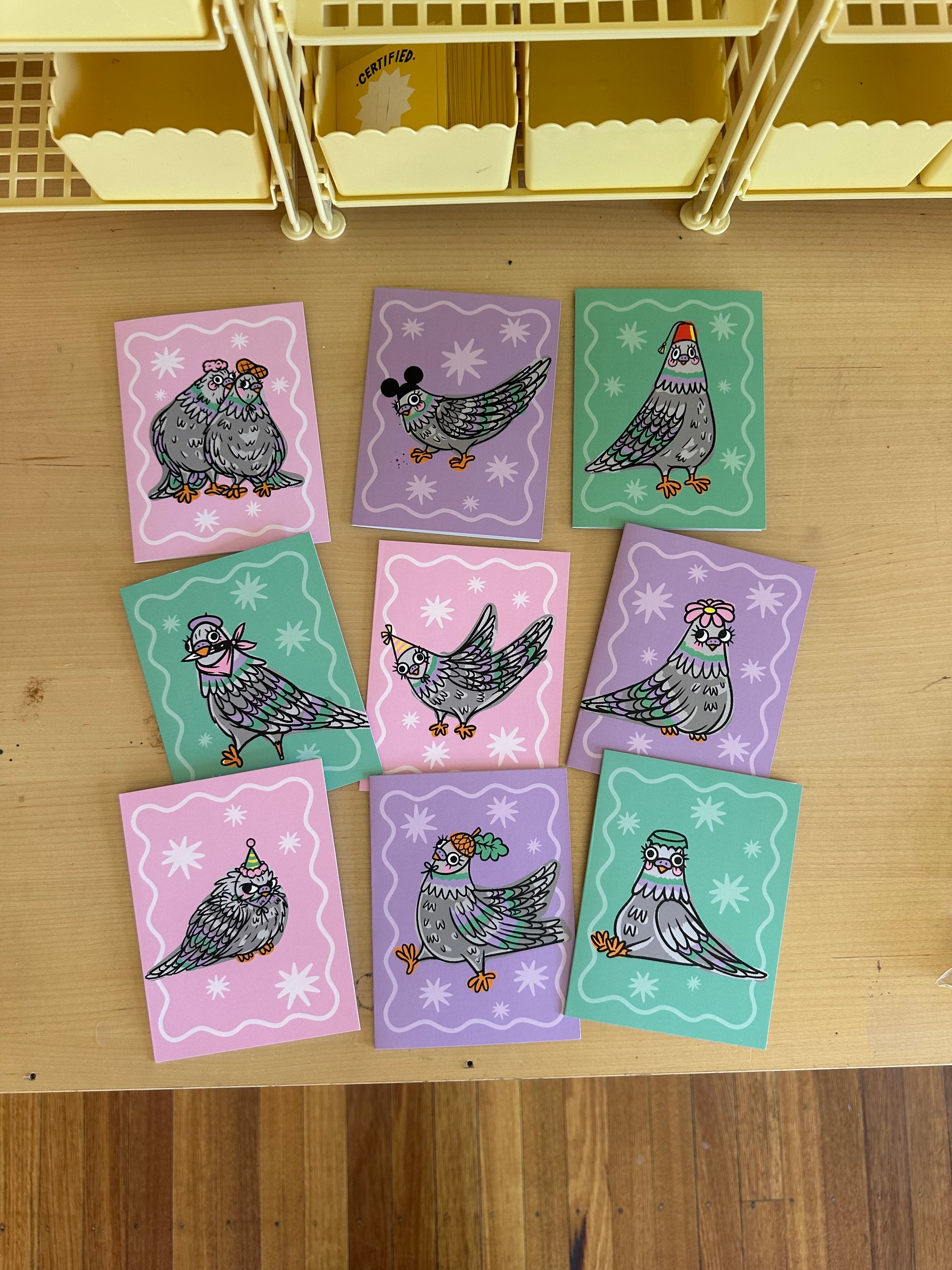 This set of 9 greeting cards features a flock of deeply unserious pigeons — side-eyeing, scheming, overthinking, and absolutely thriving in their urban era.